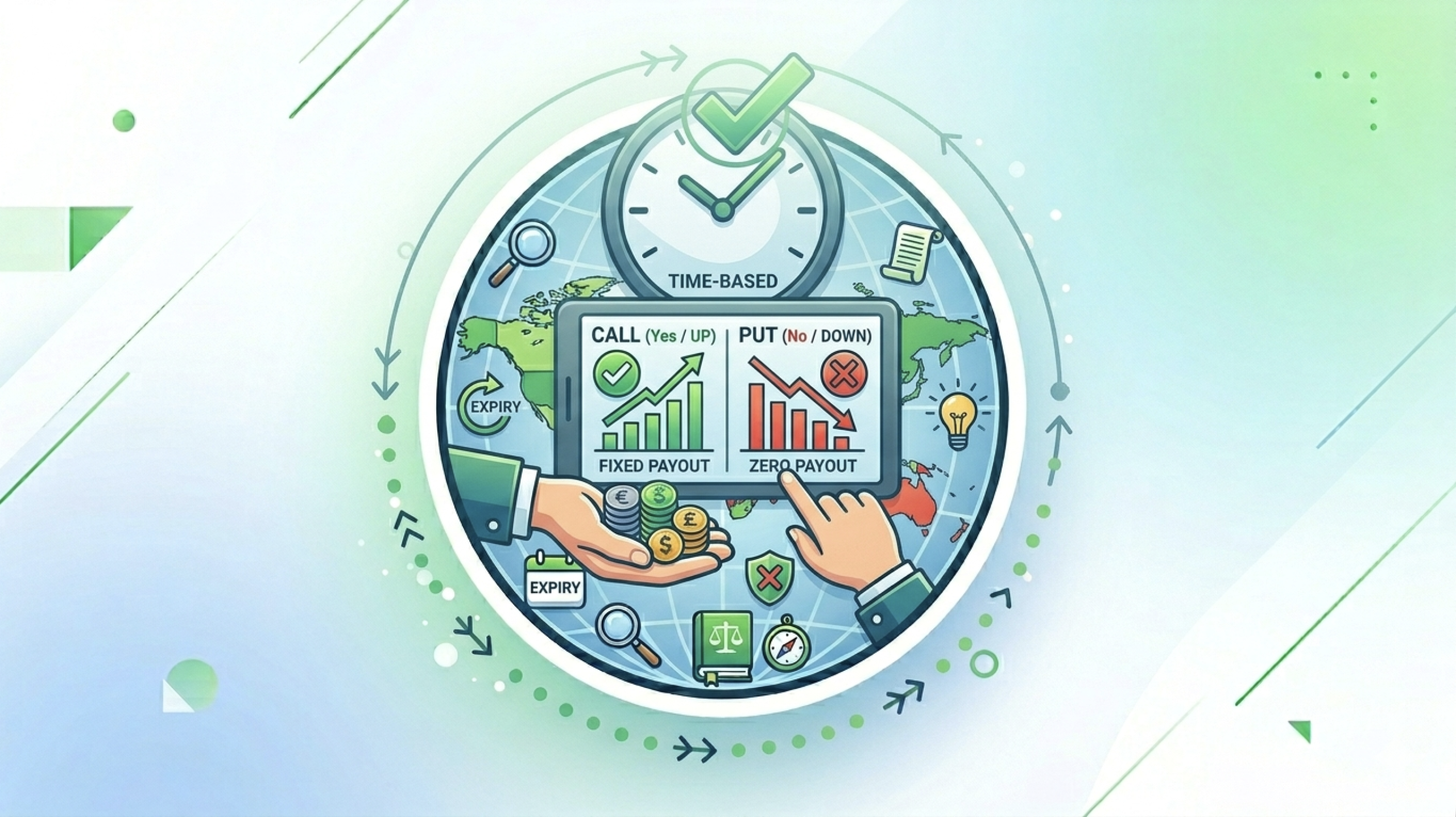 The most common type. You predict whether the asset price will be higher (CALL) or lower (PUT) than the current price at expiry. This is the format offered by the vast majority of platforms targeting retail traders in Africa, Asia, and the Middle East.